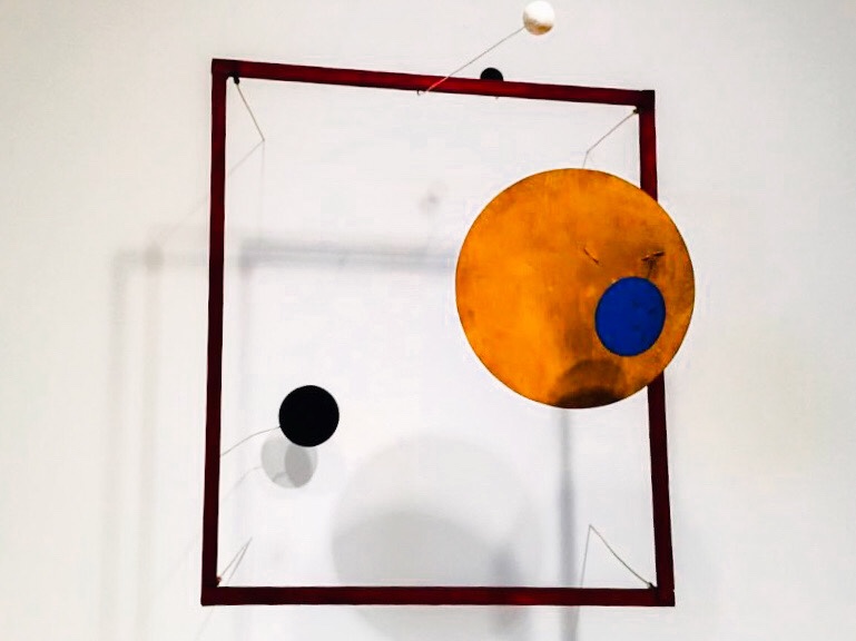 In 1930, he visited Piet Mondrian’s Paris studio. He saw walls covered with colored rectangles and imagined them moving. This inspired his next platform, shifting from figurative to abstraction. His first kinetic sculptures were motorized. The shapes and movements were inspired by an early memory of seeing the sun and the moon one morning when he was sailing through the Panama Canal. He said, “It left me with a lasting sensation of the solar system.” Albert Einstein once came to an exhibit at MoMA and stood mesmerized in front of a sculpture, A Universe, for 40 minutes. Calder later explained that Einstein instinctively knew to watch for the cycles of movement – all 90 of them.