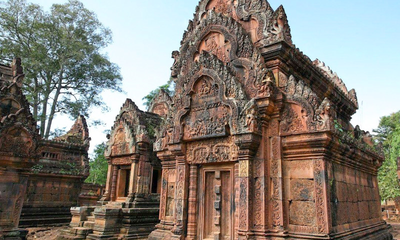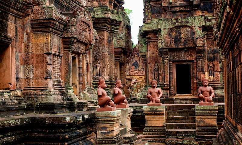 Nicknamed “Citadel of Women,” it features some of the finest stone sculptures and wood carvings of the Khmer Empire. The unique pink hue of the sandstone is striking. Virtually every bit of wall space is intricately carved with mythical scenes from ancient Indian literature.