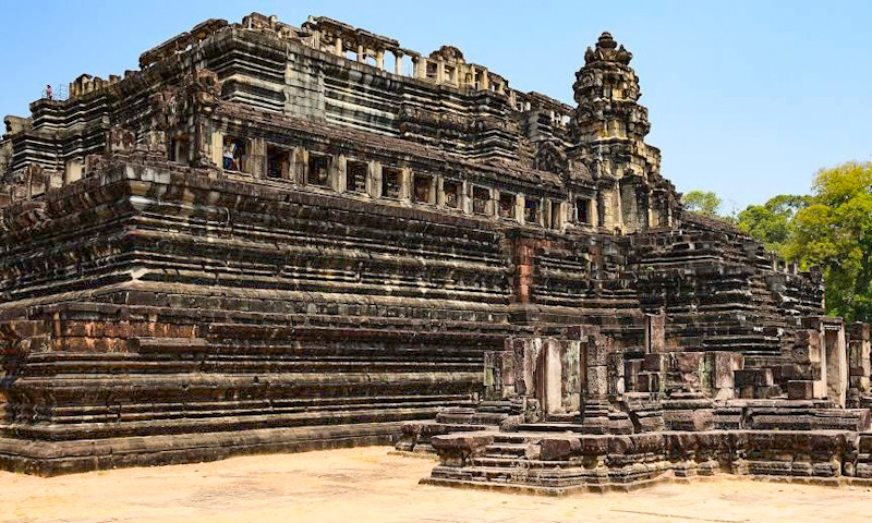Also under the Suryavarman I, the nearby Baphoun is built on an artificial hill. Its bottom floor measures 100 by 120 meters, ten times the size of Phimeanakas. Five terraces rise 35 meters high, excluding the tower which has collapsed.