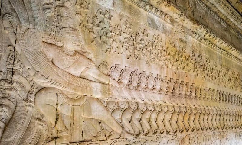 Among the many highlights of Angkor Wat are the bas-reliefs covering its walls. They stretch out over 12,000 square meters and include scenes from the Ramayana, homages to the king, and Khmer and Sanskrit inscriptions.