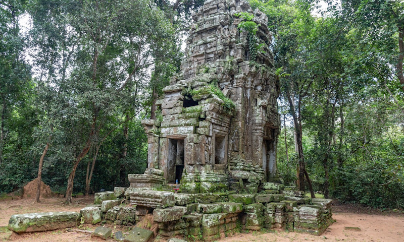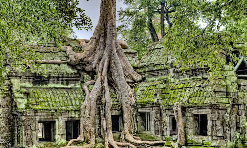 One of the most extraordinary sights in Angkor is the enormous strangler fig and silk cottonwood trees covering Ta Phrom. Although it has undergone extensive restoration, the overgrown jungle is an example of the state in which much of Angkor was first discovered by explorers in the 16th century.
