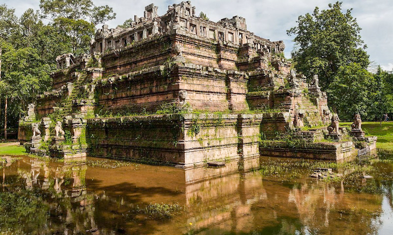 Completed by Suryavarman I at the beginning of the 11th century, Phimeanakas is unique in architecture and design. The three-tiered pyramid was built on a rectangular, slightly oblong, plan. Steep stairways lead to terraces but the tower is in ruins.
